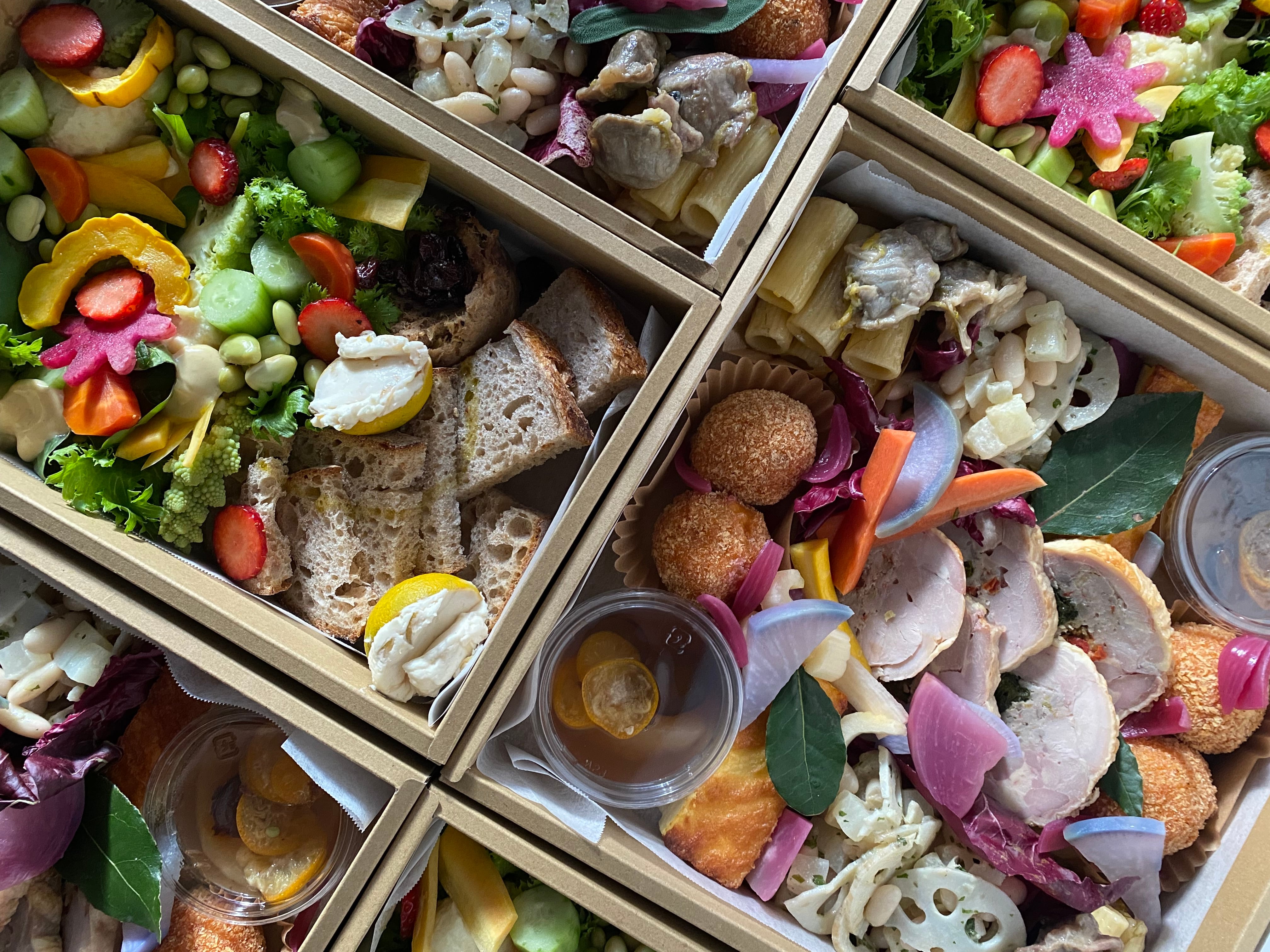 &Eat.はホームパーティーにぴったりなお肉や魚介、野菜をバランス良く詰め込んだオードブルをご用意します。今年の容器も環境に配慮しクラフト紙の紙箱でご用意致します。