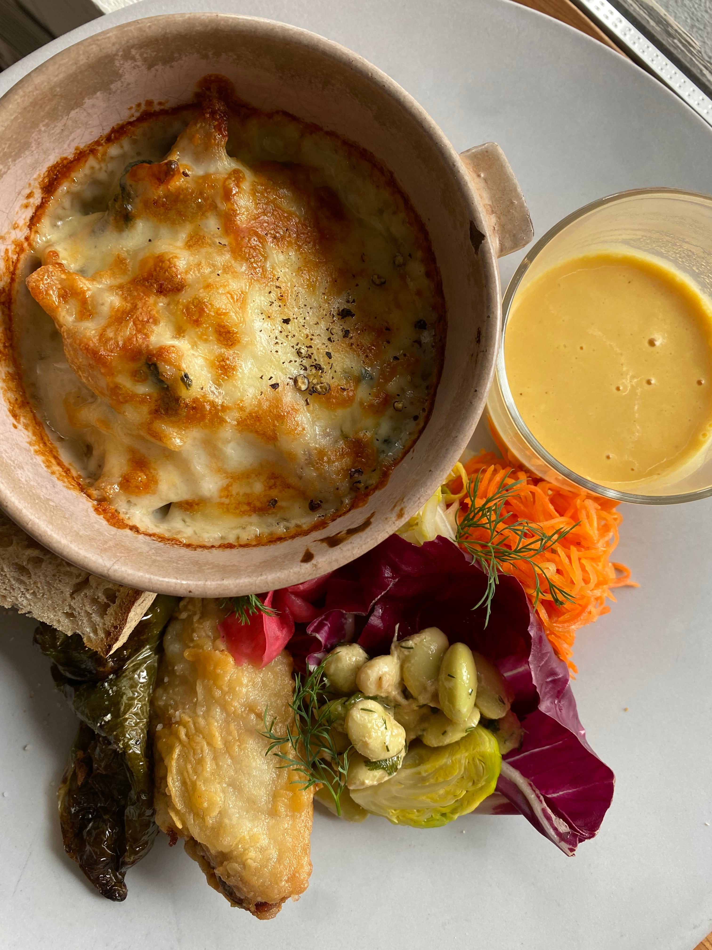 ベシャメルソースから作る、春の食材を使ったマカロニグラタンと、大葉で作るジェノバソースを使った鶏ハムのマリネのレッスンです。